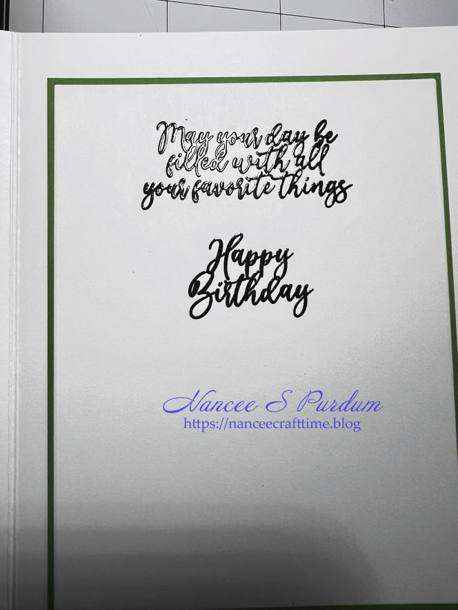 For my inside sentiment, I stamped my message in VersaClair Nocturne ink and added clear embossing powder over the top. Once I heat set it, it gives a raised appearance to the sentiment. I added a mat using the same color as the front of my card behind the inside message.