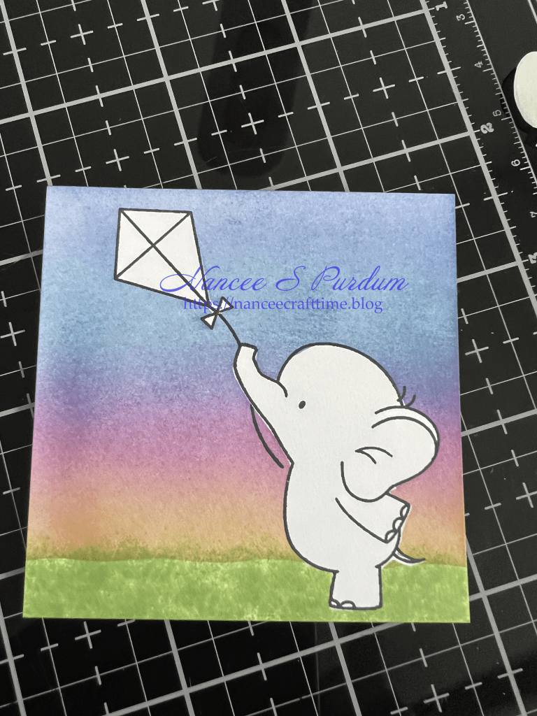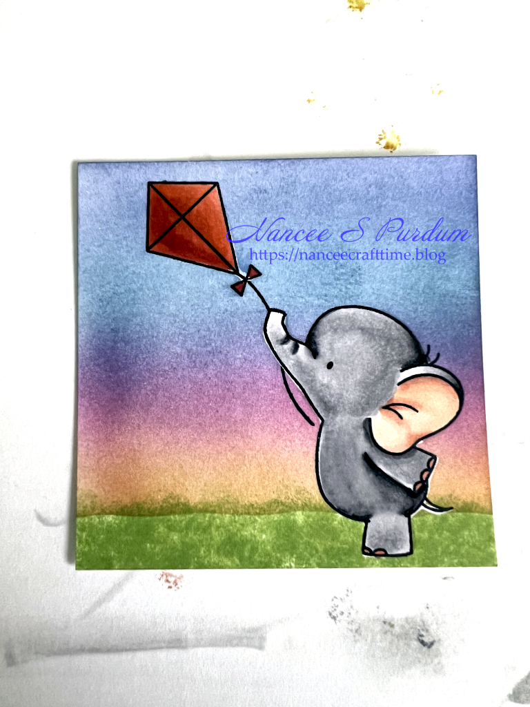 - On the third one, I ink blended a sky with some grass to ground my elephant flying a kite.