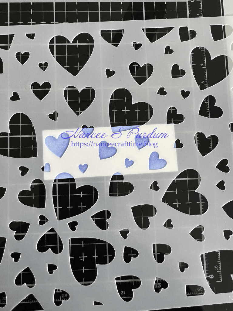 - I stenciled some floating hearts in a light blue and then adhered it to the cardbase.