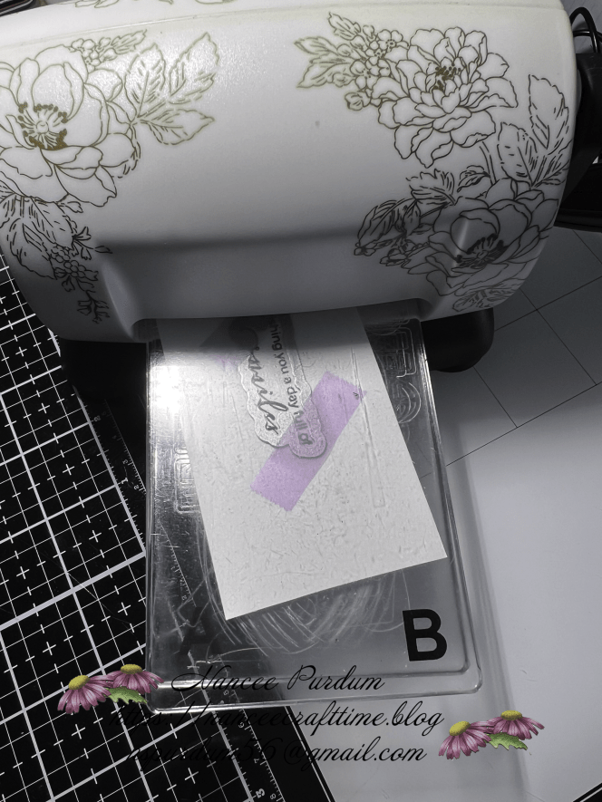 I added the pansies to the top adding some slim foam tape in the areas that needed it to make the image level. My next step was to place the sentiment. I decided to place it towards the bottom where the floral image ended. A few brown pearls added to my card and the card was complete.