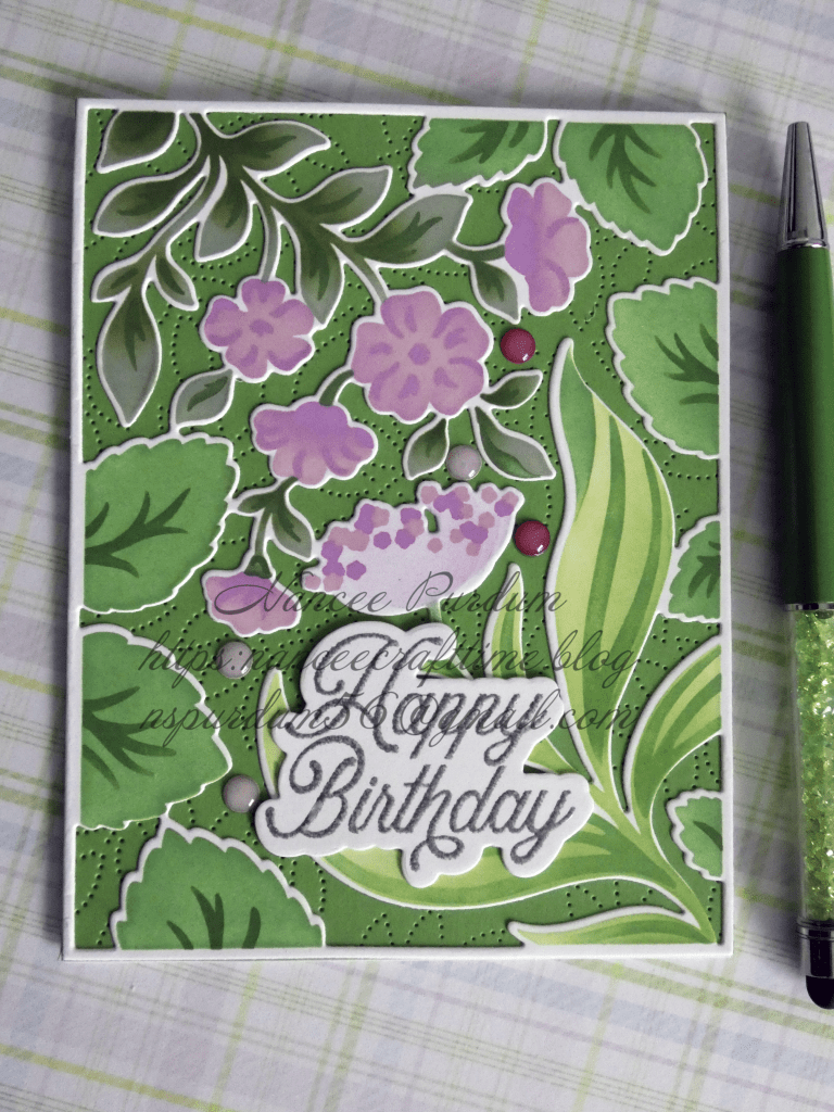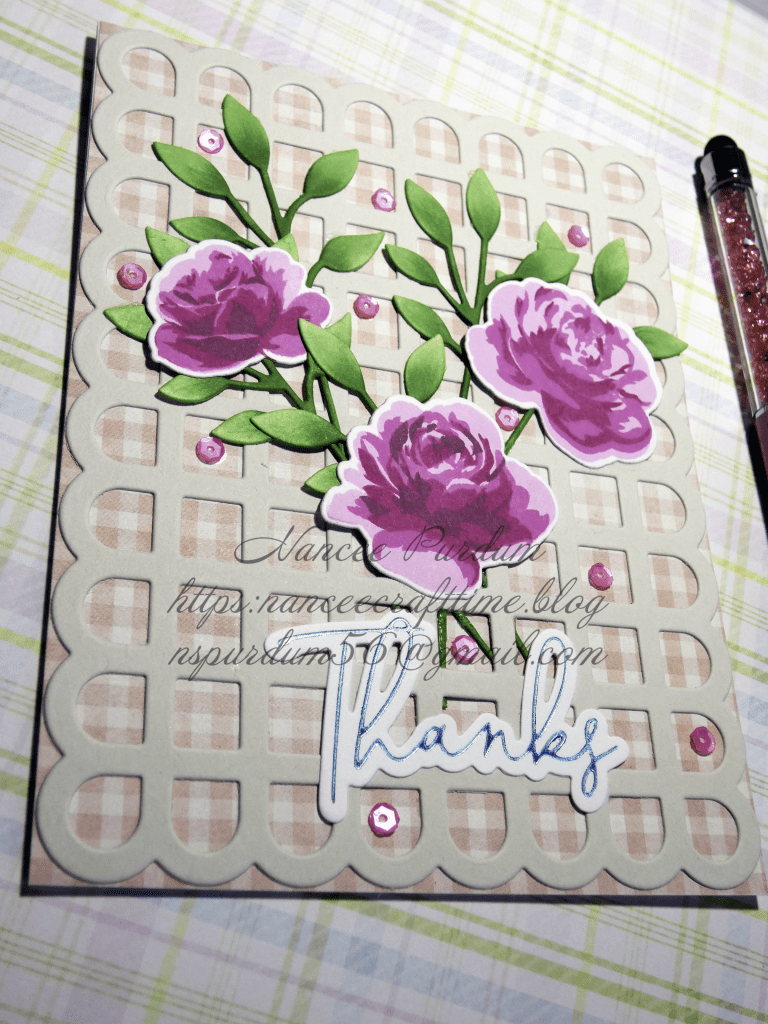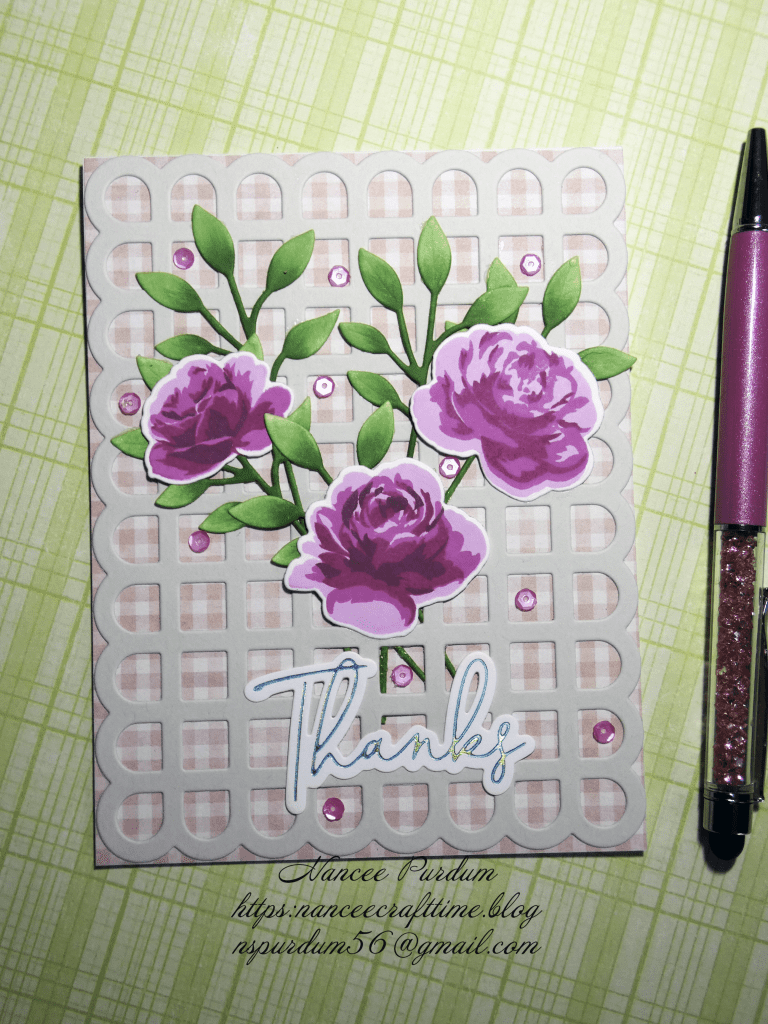 For this card below, I had die cut the Scalloped Grid Coverplate when I first received the die but when creating several cards, it just didn’t seem to fit, so I had set it aside. I decided to create a card that the background would fit. I added some pattern paper to the back of the Scalloped Grid Coverplate and create a floral foreground. I dug through my “leftovers” and found some roses that I had previously die cut and colored. I also had some leftover branches with leaves and used those to create the arrangement. A few sequins from my stash and a leftover sentiment and this card was complete.