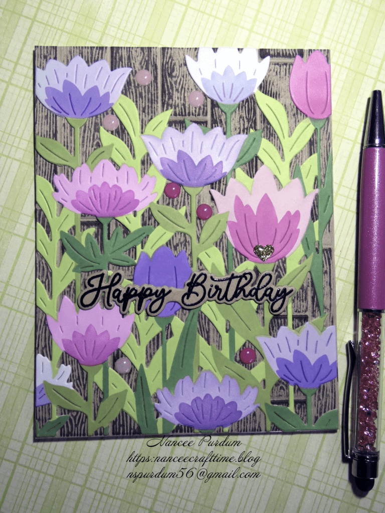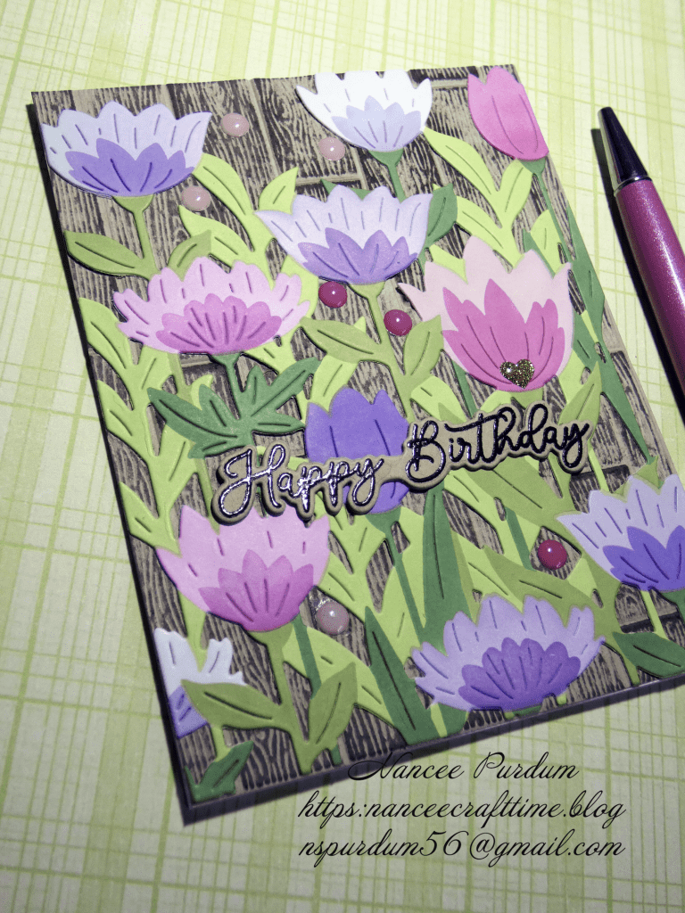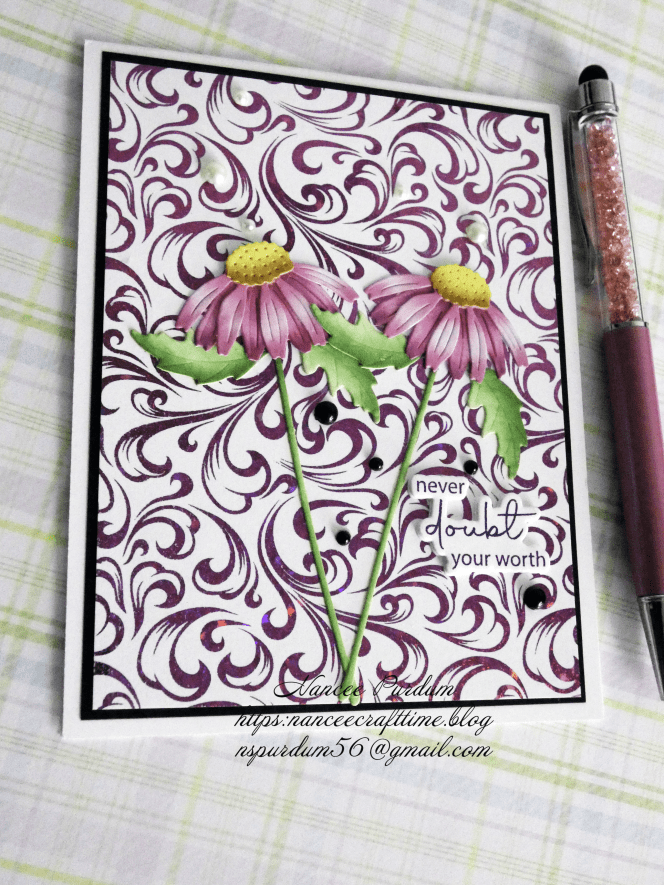 My first card uses a background piece I had foiled but changed my mind on the card I was creating. This seems to happen a lot, so I have a lot of “leftovers” sitting around. I also used some flowers I had left over from a recent card. I had die cut a number of flowers and colored them, but didn’t use them all.