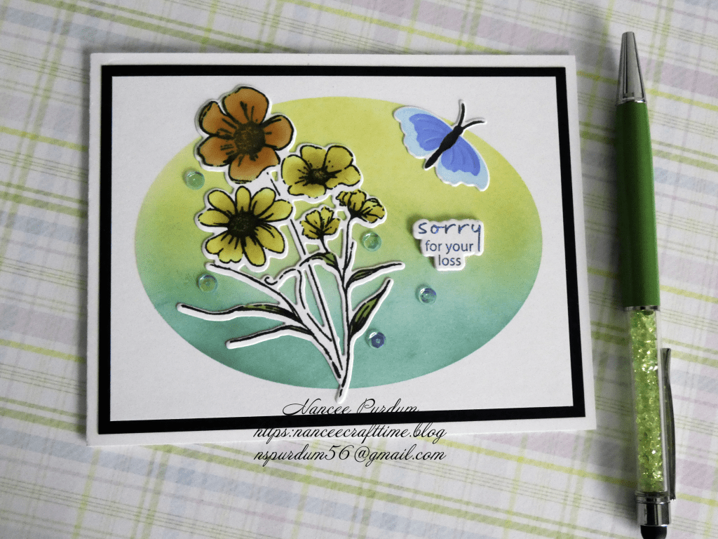 Here is another card made with a discarded background. For my original card I was going to use three to four colors, but had blended my inks a little too far so it went into my stash. The background was ink blended over an oval mask. This one was very simple to make. I added some leftover flowers and butterfly and added a sentiment from my stash. The flowers were inked up using a stencil. They were also set aside as I didn’t like the colors I had used compared to the others on the card I was making. I added a few sequins from my stash and this card was complete.