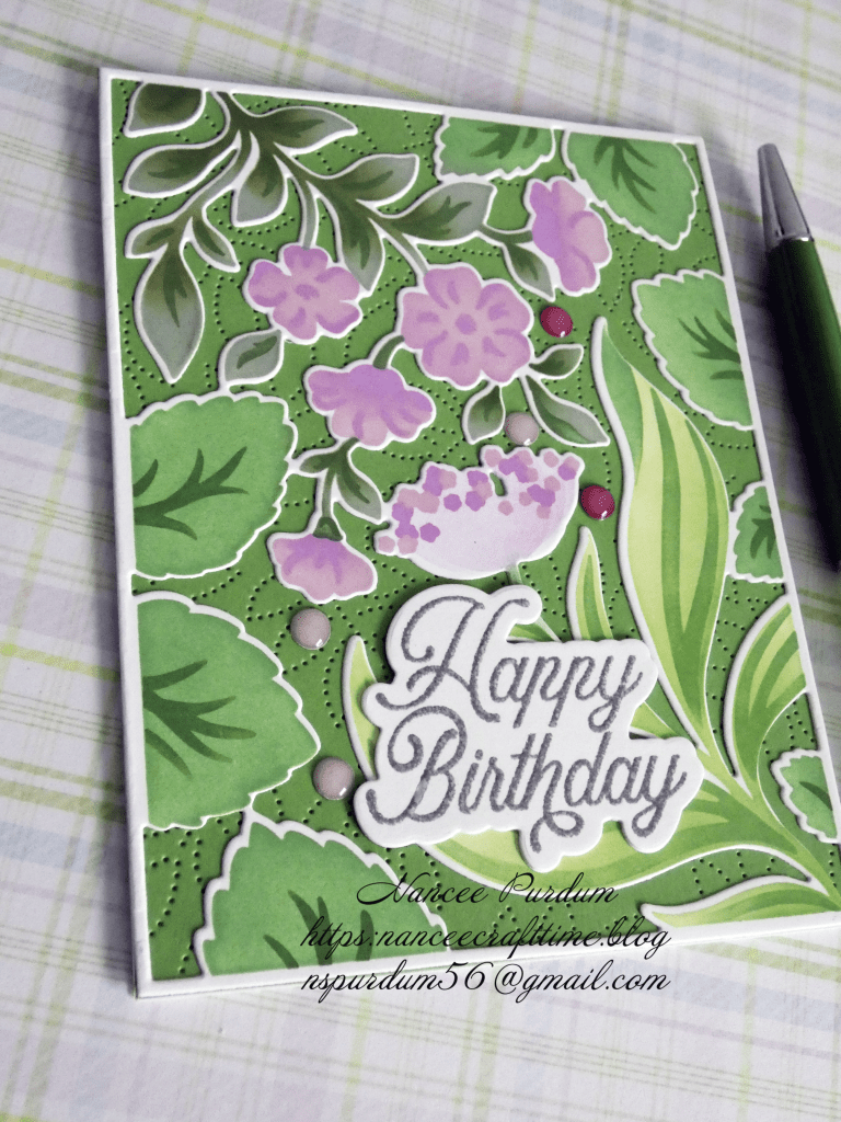 This is another simple card using leftovers. I had used a cover plate as my card background on another floral card I had made. I didn’t like the shade of green behind my original card, so the background was set aside. The foreground image was a leftover from playing with the stamp, die and stencil. I had stamped the image, colored it with the matching stencil and then die cut it. I wanted to compare that image with one not using the stamp. On my card that I sent, I had used the piece where I had stamped the image, but set this one aside for a future card. My sentiment is one of those that I had stamped and heat embossed in different colors. This one was set aside after I had used one with a different color wording. A few enamel dots completed this card.