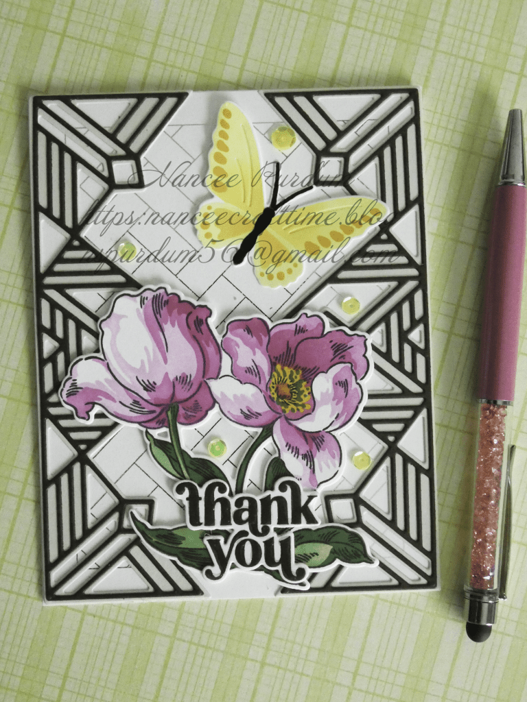 The background on this card was a foiled background that I hadn’t used. I combined several different pieces from several different cards that I had made. The borders were from a recent card that I had made. I made several of these borders from different colors, and again, this one was set aside. The floral image was one that I had colored using a stencil. On the original card, I had colored the image in Copic markers and had used that image on my previous card. The butterfly is also a leftover from a previous card. My sentiment was a heat embossed sentiment I had in my stash. I had made several of these sentiments and set them aside to use on future cards. Again, I added a few sequins from my stash and this card was complete.