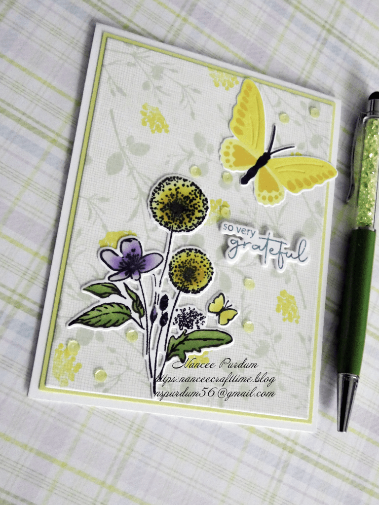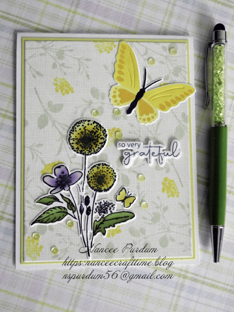 For my final card today, again, I used all leftover pieces. The background was created after watching a Gina K video on creating a background from different stamps. I had created several of them and decided to use this one for my card. Again, the floral image, butterfly and sentiment are left from previous cards. As with my previous cards, I added sequins from my stash.