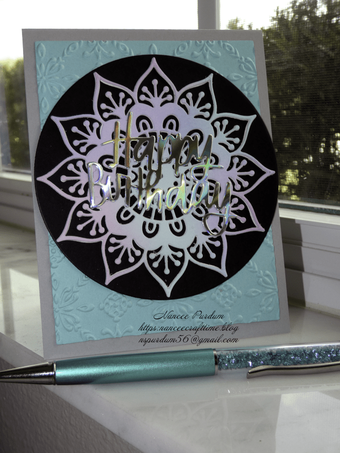 My background was made with an embossing folder and colored cardstock. When I placed the die cut on top of the embossed background I felt it needed something behind the die cut to make it stand out more. I die cut a circle from some black cardstock and liked the look.